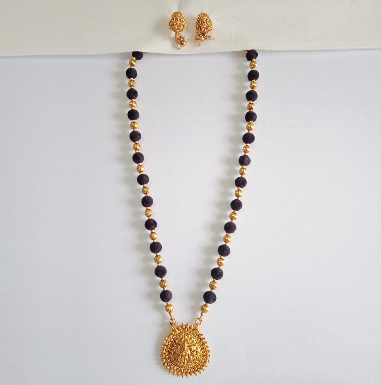Gold and Black Velvet Beads Haram with Lakshmi Pendant Set is a traditional temple jewellery piece crafted with rich velvet beads and a beautifully detailed Lakshmi pendant, perfect for weddings and festive occasions. This gold-plated haram set adds an ethnic royal touch to silk sarees and traditional outfits, making it a popular choice among women looking for South Indian imitation jewellery.