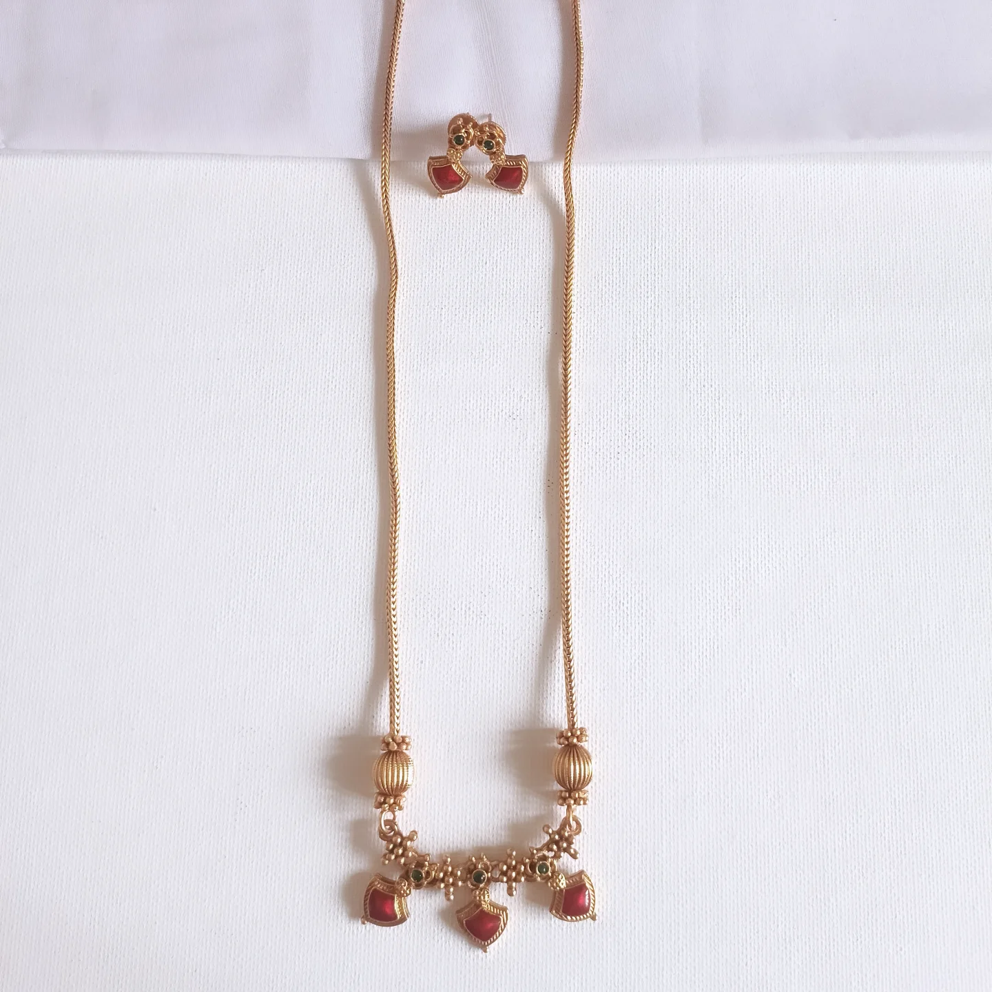 This jewellery set includes a beautifully crafted necklace along with matching earrings, creating a complete traditional jewellery look. The detailed craftsmanship and classic Kerala design make this necklace set a perfect addition to your jewellery collection.