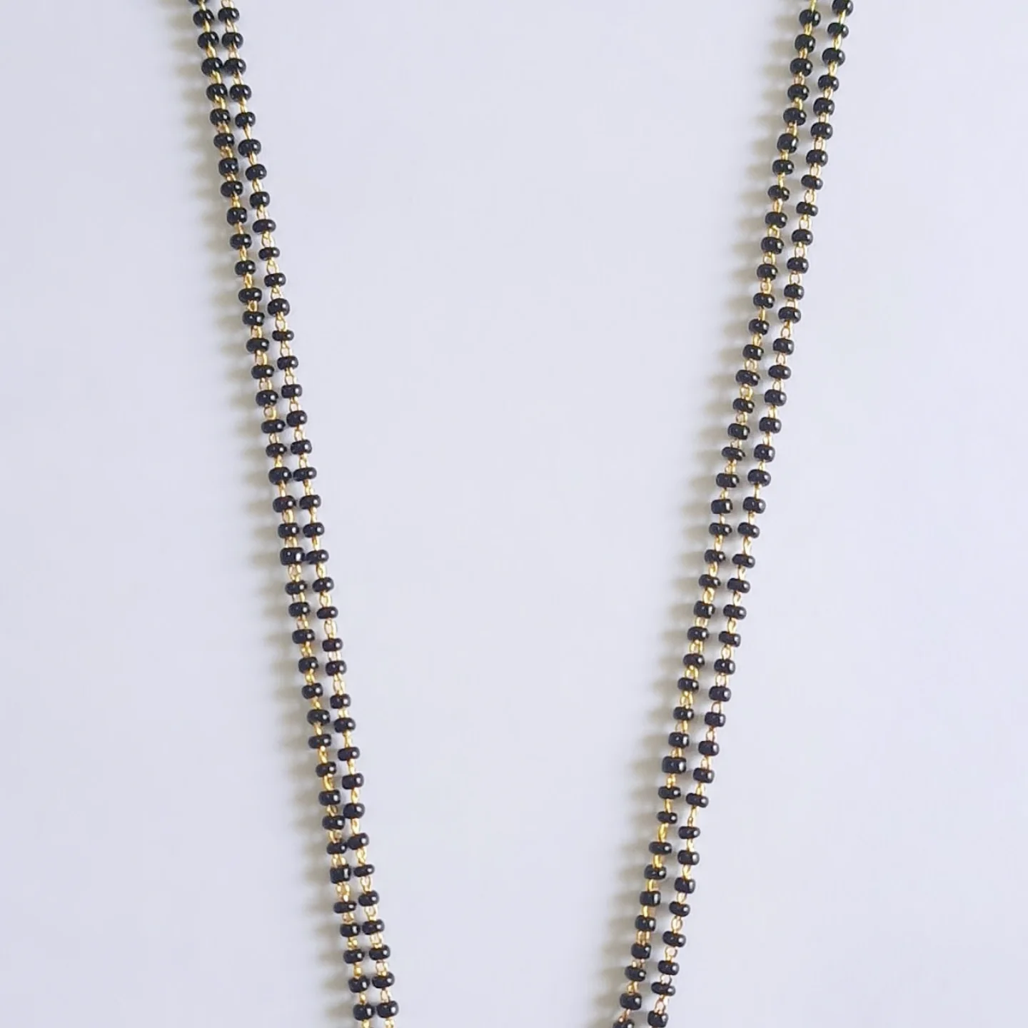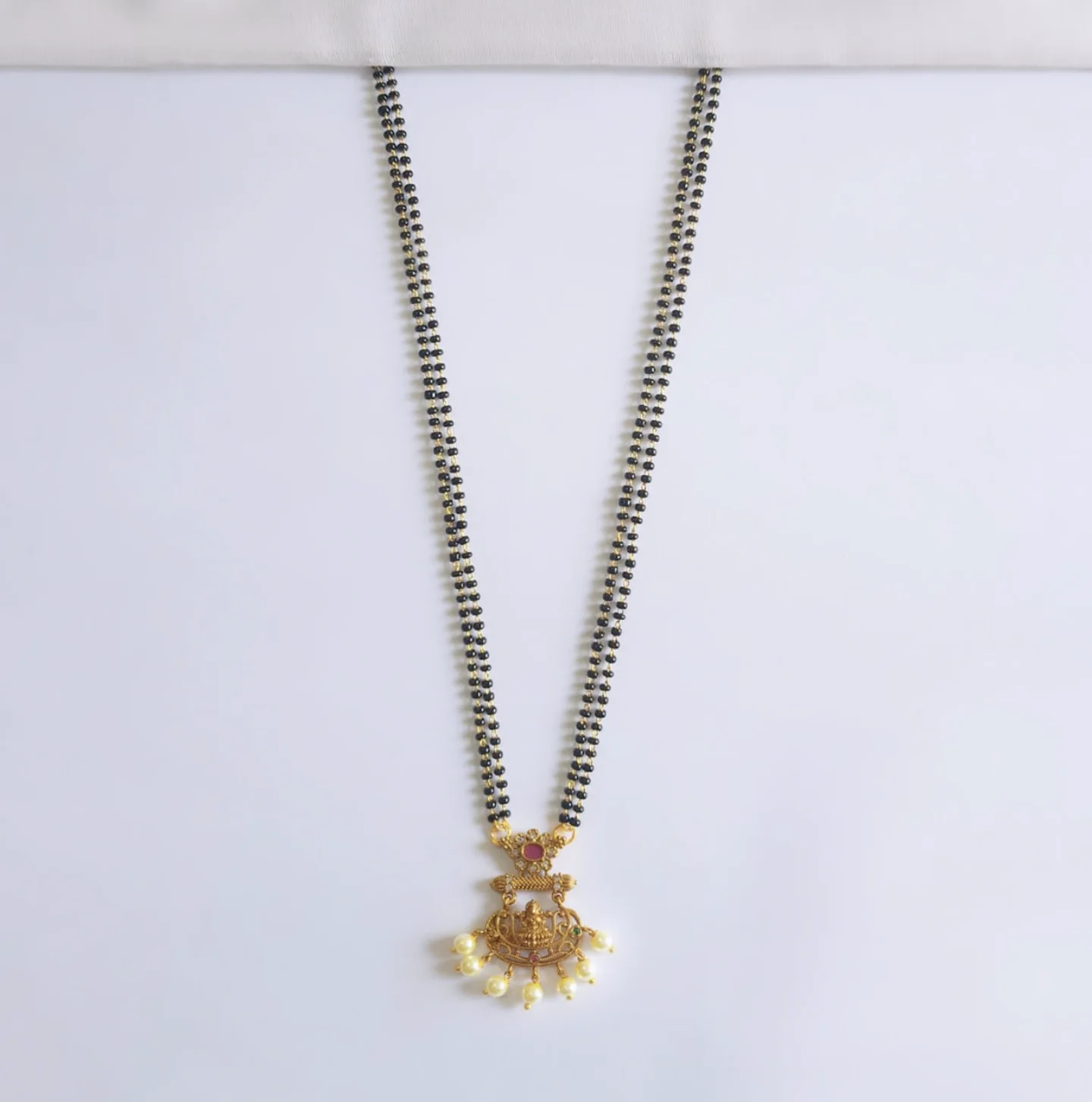 Lakshmi Mangalsutra with Double Strand Black Bead Chain is a graceful traditional jewellery piece that blends divine Lakshmi motifs with classic mangalsutra design. Crafted with a gold-toned finish and double strand black beads, this set is ideal for daily wear, pooja functions, and festive occasions.