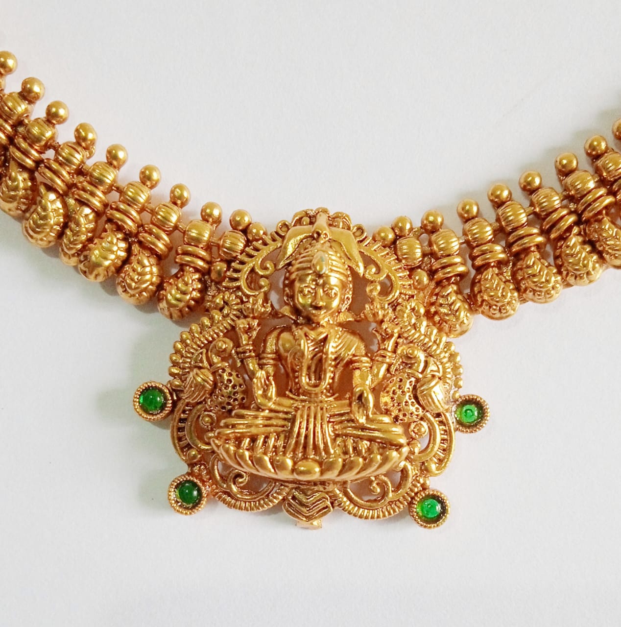 Traditional Lakshmi Pendant Green Stone Mango Necklace Set is a classic South Indian jewellery design that blends divine Lakshmi motifs with elegant mango-shaped elements. Crafted with vibrant green stones and an antique gold finish, this necklace set is ideal for weddings, temple visits, and festive occasions.